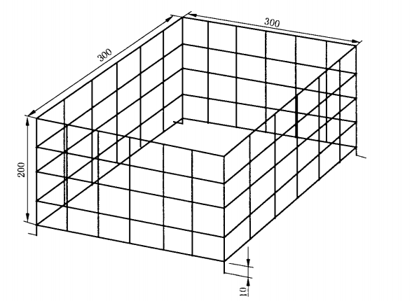 3.6火源A:金属网格尺寸为50mmX50mm。金属框上部和底部敞开,每个角配有1条伸出长度为10mm的支脚。金属框的整体尺寸应为300mmX300mm,深200mm(见图1);